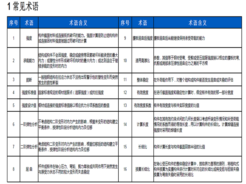 10、通用高厚比:参数,其值等于钢材受弯、受剪或受压屈服强度除 以相应的腹板抗弯、抗剪或局部承压弹性屈曲应力之商的平方根。